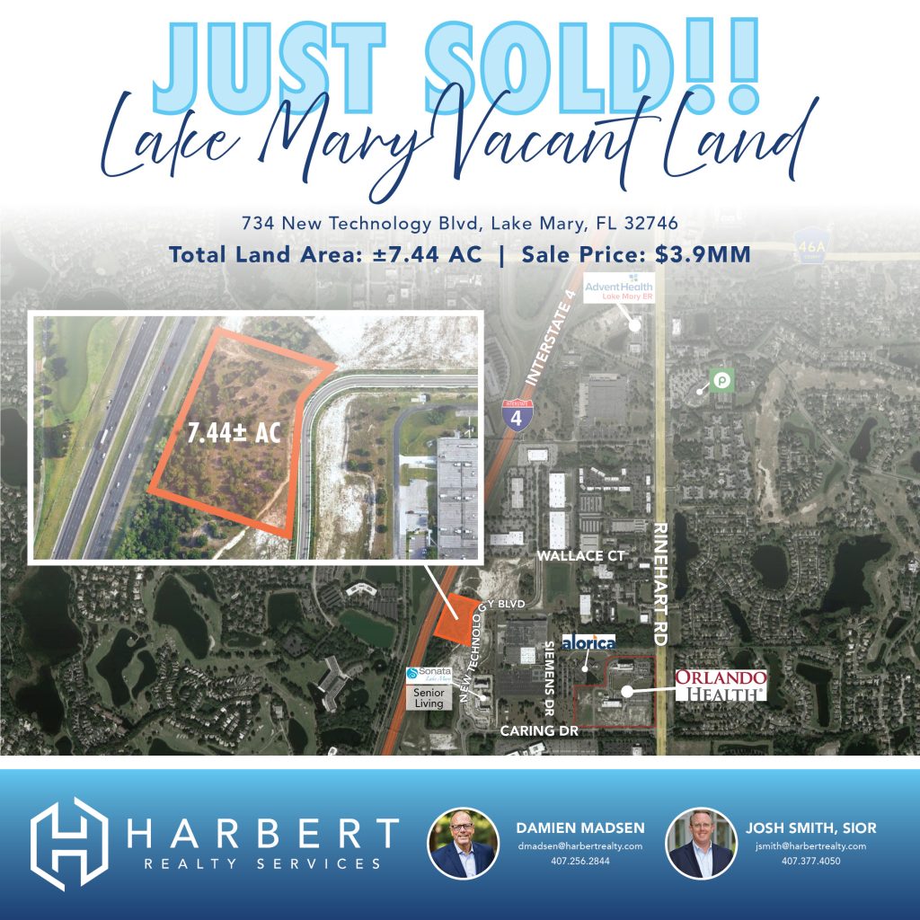 Harbert Realty Services announced that brokers Damien Madsen and Josh Smith successfully represented the seller in the disposition of 7.44± acres of highly visible land located off Interstate 4 in Lake Mary, Florida.