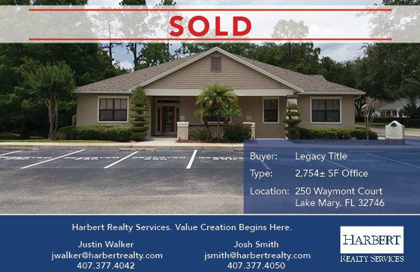 Harbert Realty Services of Florida’s Senior Associate Justin Walker and Vice President/Managing Director Josh Smith represented the buyer of a 2,754± SF office building located at 250 Waymont Court, Lake Mary, FL