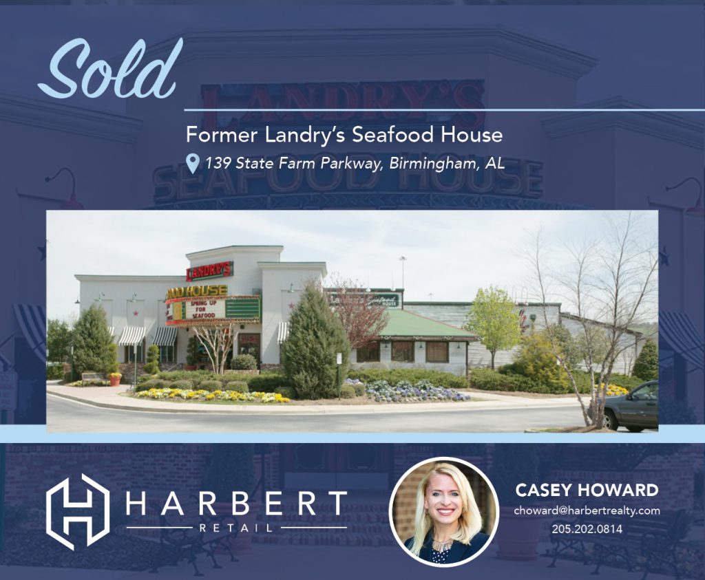 Harbert Retail’s Casey Howard represented the buyer of the former Landry’s Seafood House for $1.5M. The freestanding ±7,650 SF building, which is located at 139 State Farm Parkway, offers prime visibility from I-65 and Lakeshore Parkway. The property is located within a highly active corridor with nearby retailers including Walmart, Sam’s Club, Hobby Lobby, Planet Fitness, Chick-fil-A Restaurants, Taco Bell, McAlister’s Deli, Restaurant Depot and more.