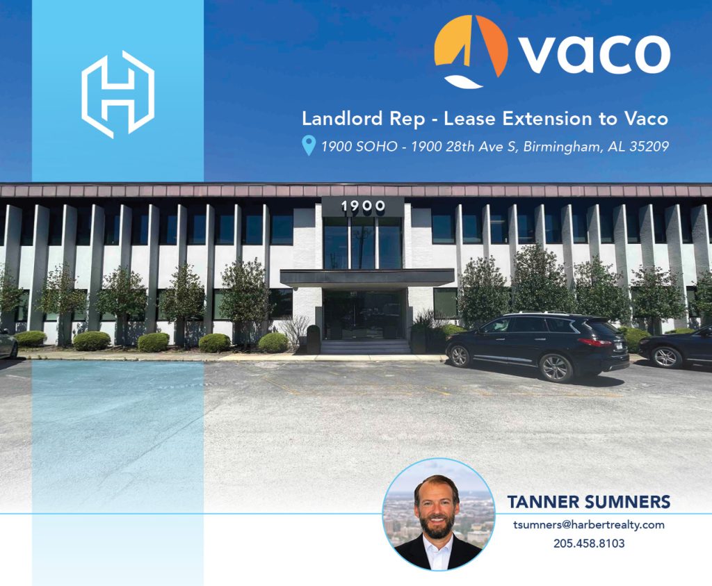 Harbert Realty’s Tanner Sumners represented the landlord in a lease extension deal at 1900 Soho with Vaco, an end-to-end talent solutions provider with offices across the US and Canada. Bo Grisham with Graham & Company represented the tenant. 1900 Soho is situated in the heart of downtown Homewood with convenient access to US 280/31 near retail, restaurants, hotels and more! For more information, view the flyer: https://www.harbertrealty.com/wp-content/uploads/2024/05/2024-05-1900-Soho.pdf