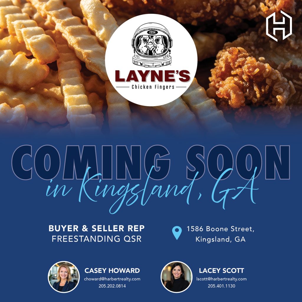 Harbert Retail’s Casey Howard and Lacey Scott successfully represented both the seller and the buyer in a $1.65MM deal bringing Layne’s Chicken Fingers to the former Hwy 55 location in Kingsland, GA. This 2,598 SF freestanding drive-thru is strategically positioned along Boone Street and E King Avenue which boasts traffic counts of +23,200 AADT, along one of Kingsland’s busiest corridors. It’s poised to be a prime spot for Layne’s, benefiting from its proximity to a variety of retail establishments along the high-traffic corridor including Publix, Popshelf, Harbor Freight, Planet Fitness, tropical Smoothie and more.