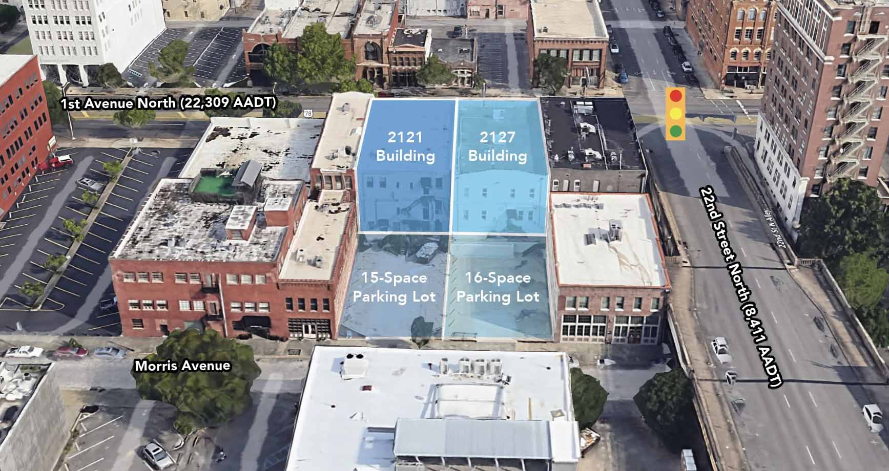 2121-2127 is poised to take advantage of the recent growth taking place along 1st Avenue North and Morris Avenue. Founders Station and Mercantile on Morris, which front both 1st Ave and Morris and features upscale dining and retail space and condominiums, have been met with much excitement and bring traffic to the area. The Kelly Hotel opened in 2021, just blocks away. The Row5 development on Morris, featuring 5 luxury row-houses, was recently completed and all units have been sold. These are just a few of the exciting projects creating momentum in this high growth 1st Avenue North corridor.